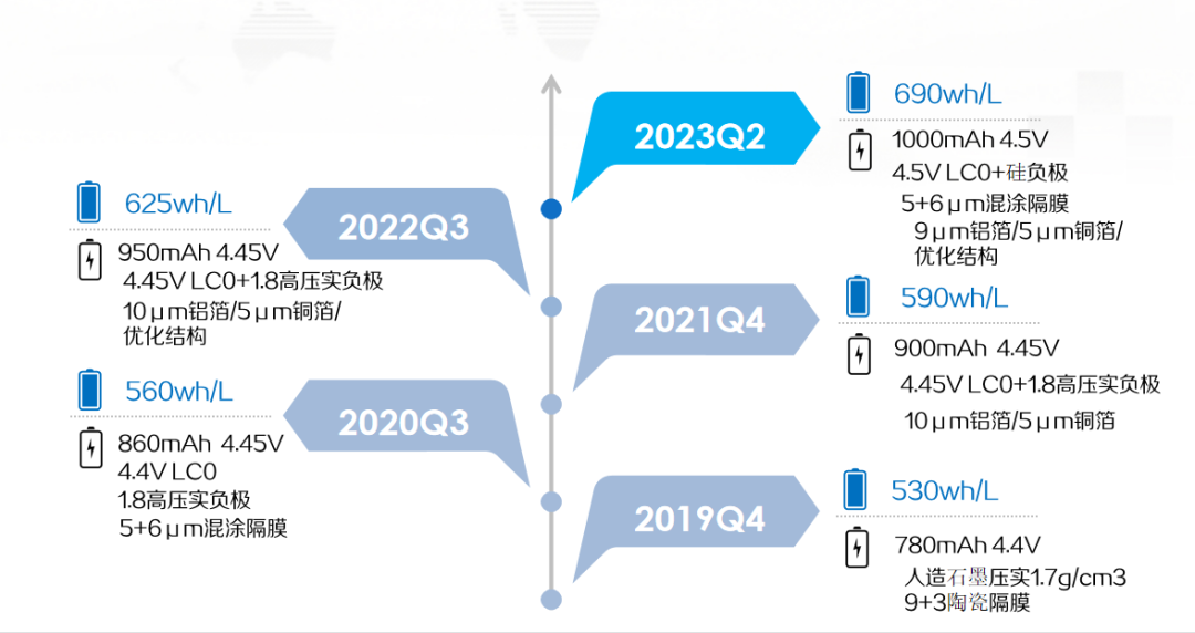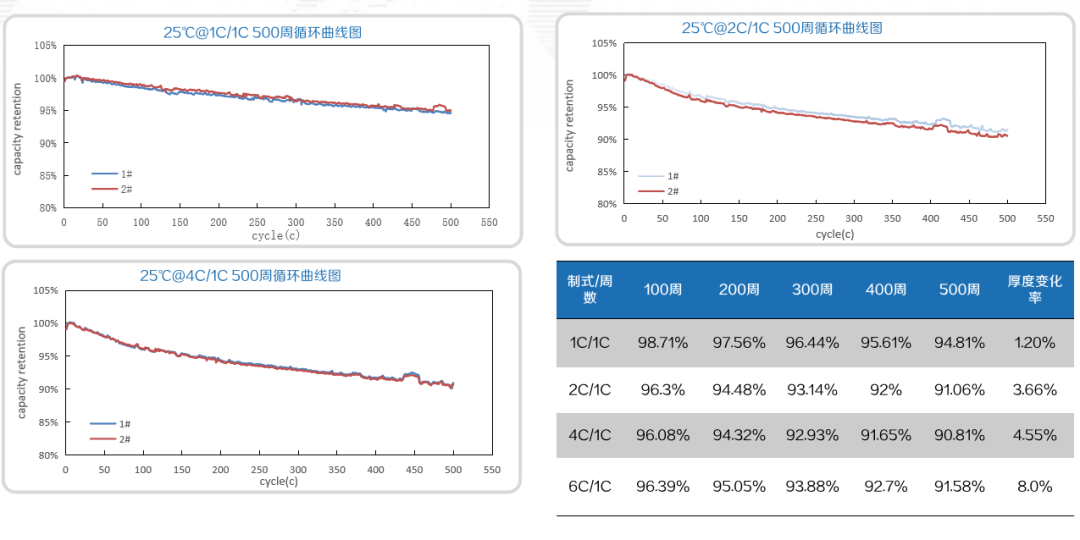 此型號(hào)目前電壓體系已經(jīng)做到4.5V,電池容量已經(jīng)可以做到1000毫安時(shí),市面上多數(shù)同尺寸電池容量達(dá)到到780毫安時(shí)左右,比市面同尺寸電池能量密度高出20%,同時(shí)滿足500周電池壽命。