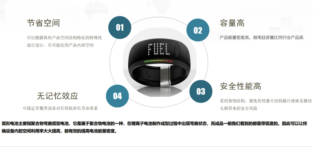 眾旺德開發(fā)的弧形電池能夠根據(jù)設(shè)備的內(nèi)部結(jié)構(gòu)空間來呈現(xiàn)一定的弧度。有效利用設(shè)備空間,提高電池容量,目前主要應(yīng)用與智能戒指等新興智能穿戴領(lǐng)域。